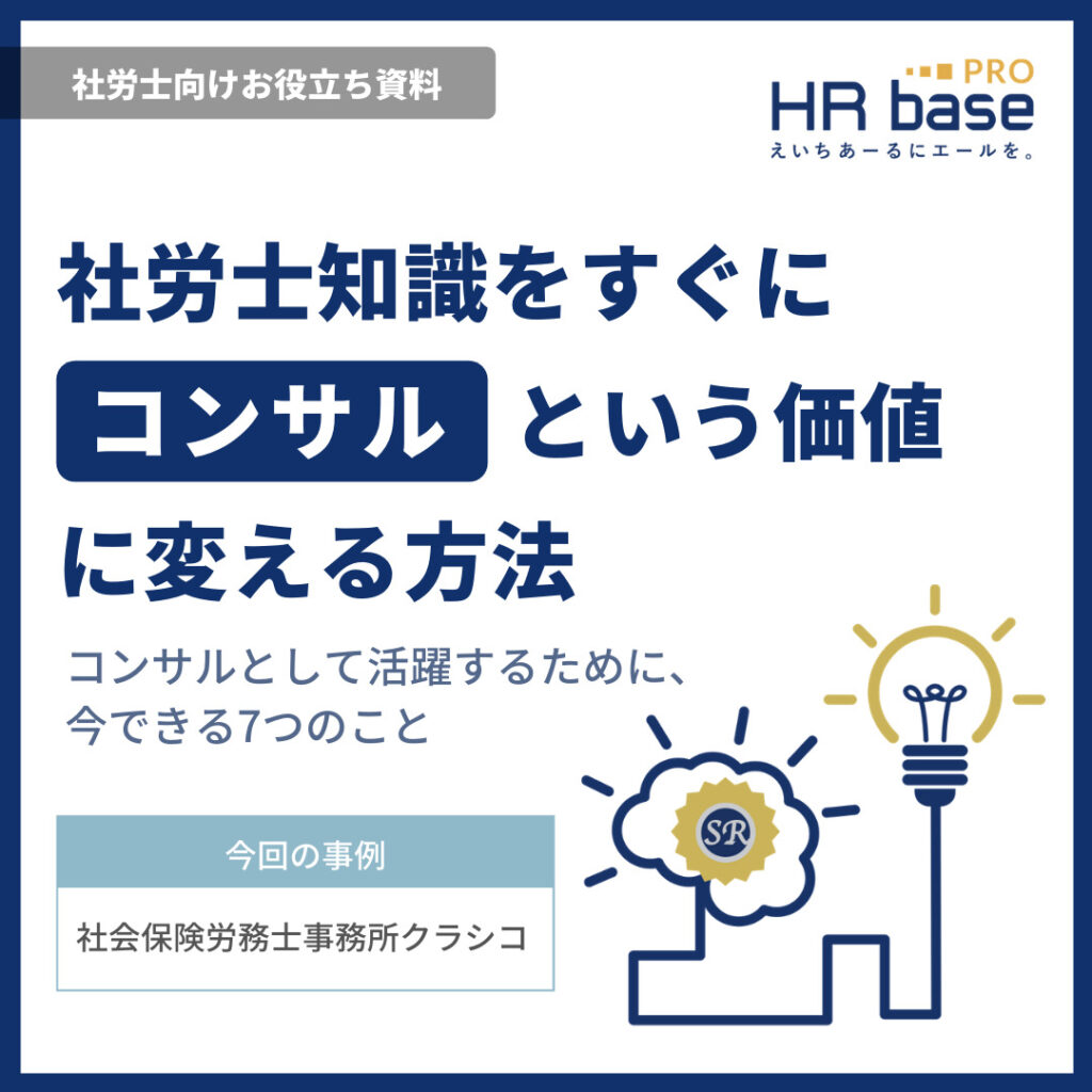 最近では事務手続きをクラウドサービスやAIに任せ、専門知識をフルに活かしたコンサルティング型に舵を切り直す事務所が増えています。実際、HRbase PROのご提供するダウンロード資料でもコンサルティングに関するテーマは人気です。