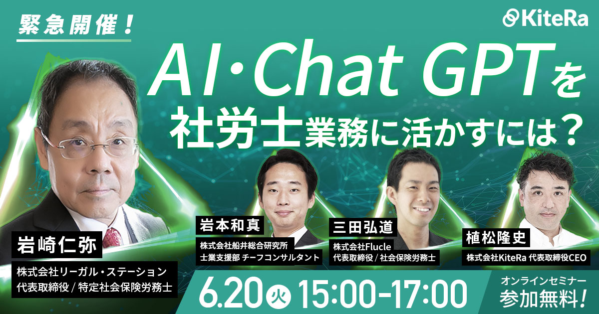 本セミナーの前半では、株式会社リーガル・ステーション代表取締役の岩崎仁弥先生より、今後必須となるAI技術の活用の方法などを徹底的に解説いただきます。後半ではさらに株式会社船井総合研究所の岩本様・株式会社Flucleの三田先生をお招きし、AI時代の社労士の経営戦略・労務相談・就業規則について、岩崎先生とディスカッションを行います。