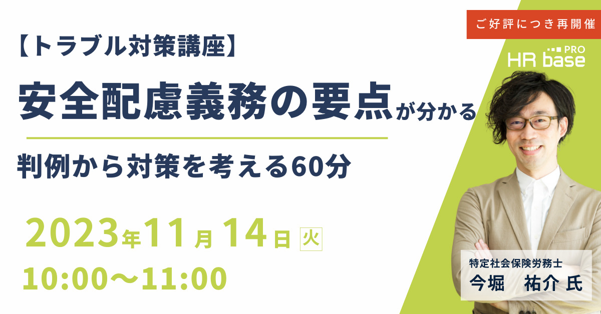 本セミナーでは、法律事務所でパラリーガルとして数々の労使紛争案件に携わった経験をもつ特定社会保険労務士の今堀氏が、安全配慮義務とは何か、その必要性と、実際の判例を元にした対策と体制構築などを解説いたします。顧問社労士として、顧問先が安全配慮義務違反を行う前に対策を講じておきませんか?