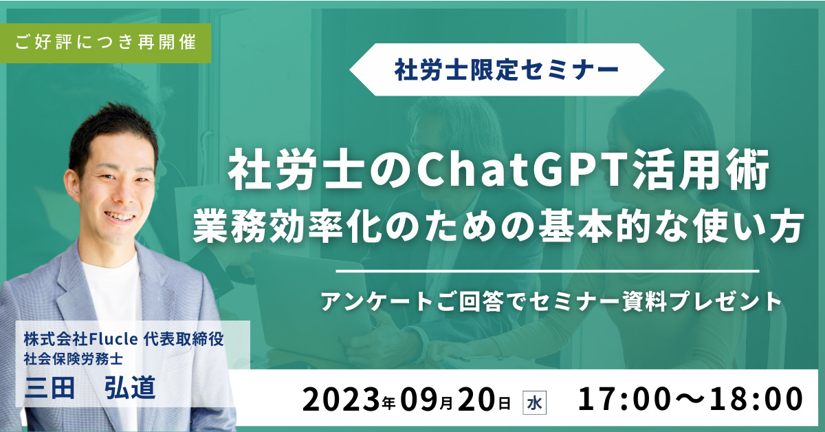 | セミナー名 | ご好評につき再開催!【社労士のChatGPT活用術】業務効率化のための基本的な使い方 |