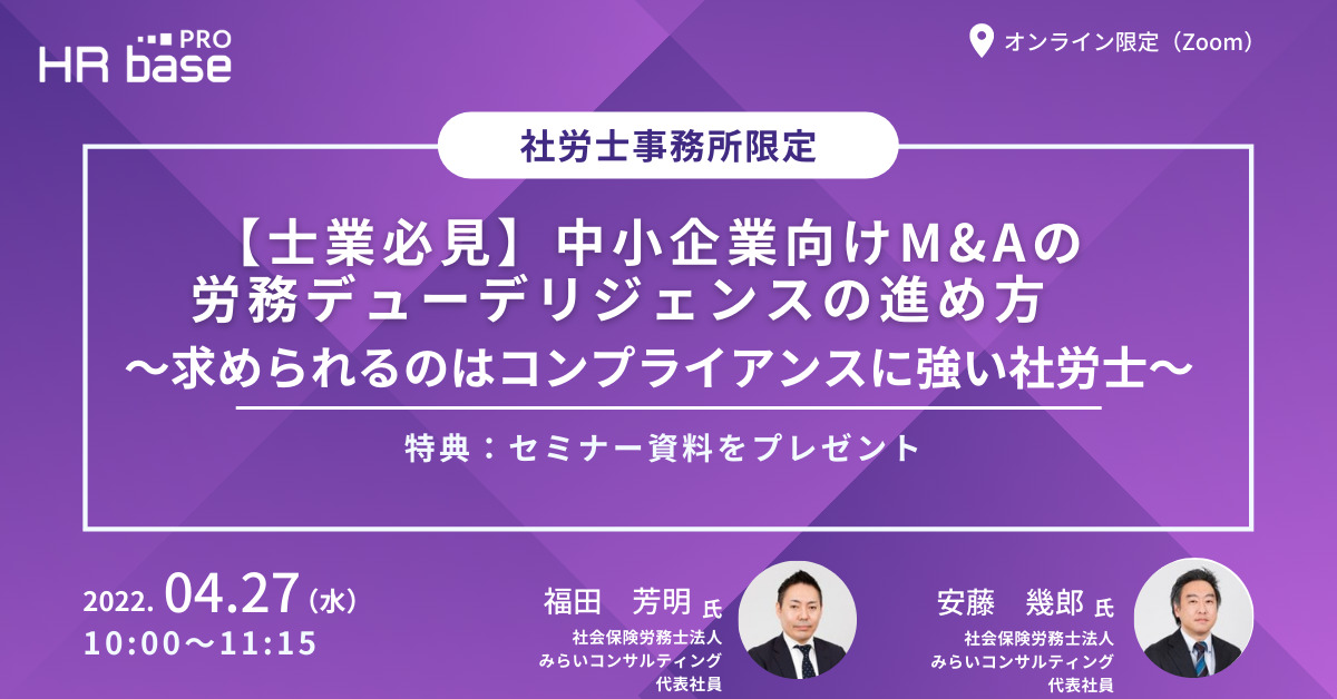| 【士業必見】中小企業向けM&Aの労務デューデリジェンスの進め方 ~求められるのはコンプライアンスに強い社労士~ | |