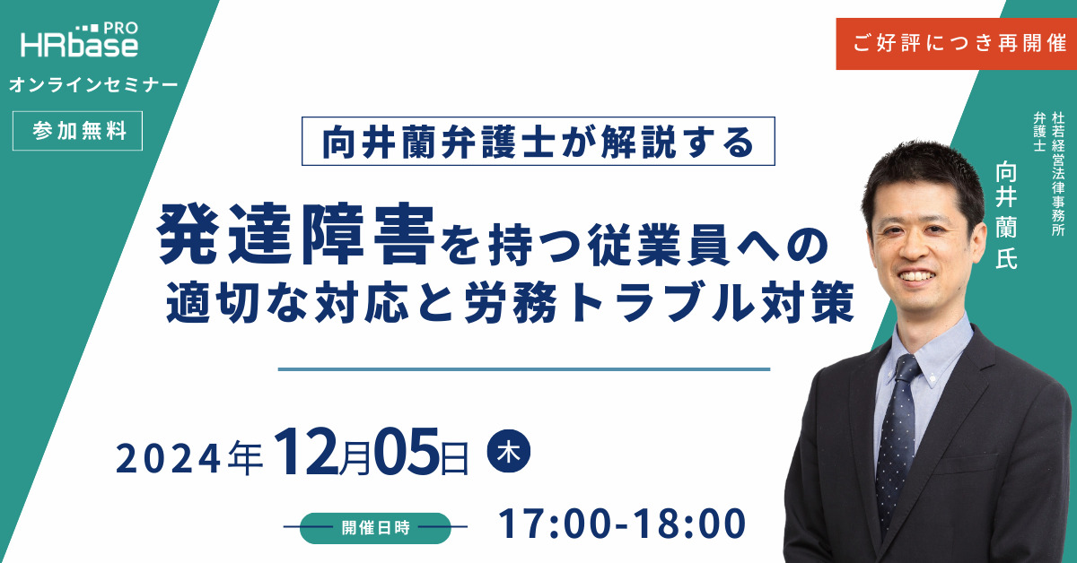 | セミナー名 | ご好評につき再開催!【向井蘭弁護士が解説する】発達障害を持つ従業員への適切な対応と労務トラブル対策 |