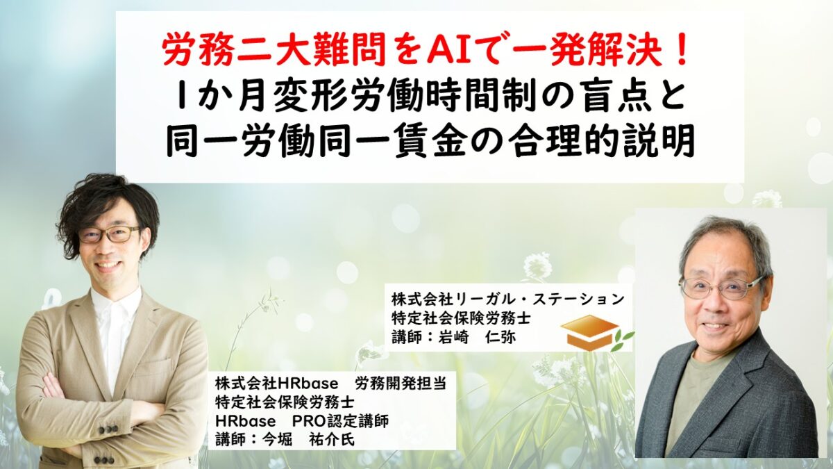 | セミナー名 | 労務二大難問をAIで一発解決!1か月変形労働時間制の盲点と同一労働同一賃金の合理的説明 |
