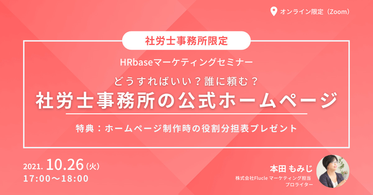 士業事務所限定! HRbase PROのマーケティング担当が、「社労士事務所の公式ホームページ」をつくるときの役割分担について分かりやすく解説します。アフターコロナの営業戦略としてホームページの活用を考える、すべての先生に聞いていただきたいセミナーです。