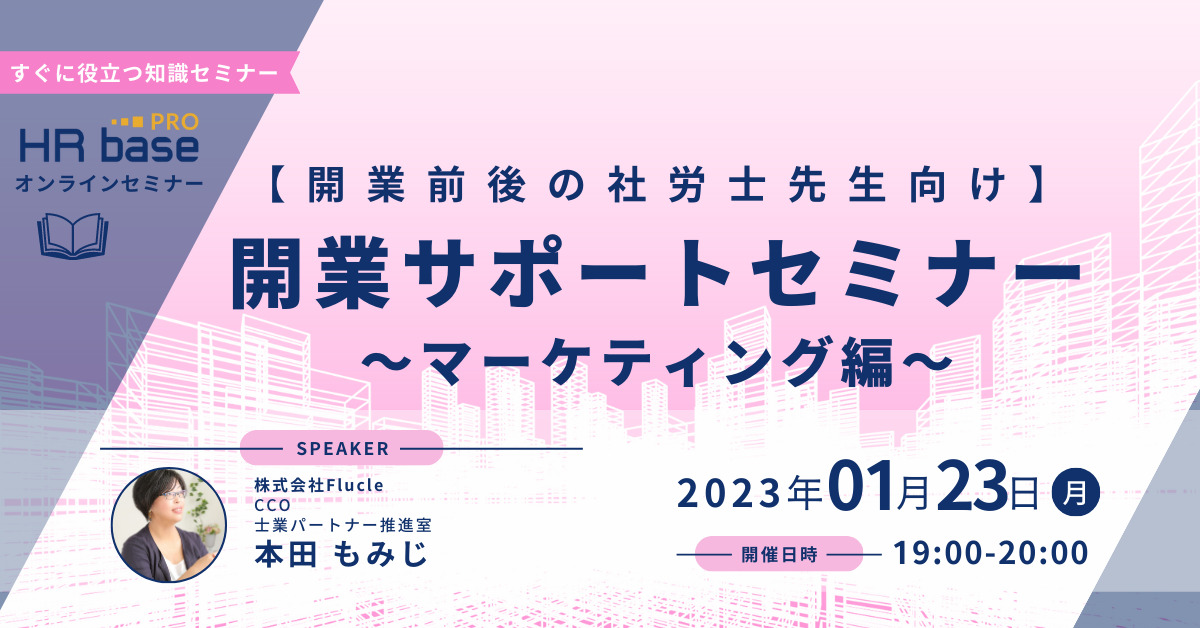 開業前〜1年目の社労士事務所向け! HRbase PROが、開業前・開業後すぐで使えるマーケティング手法の発見方法を解説。開業後の具体的なヒントを持ち帰っていただけます。