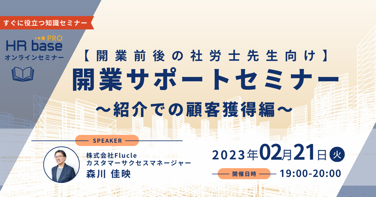 開業前〜1年目の社労士事務所向け! HRbase PROが、開業前・開業後の課題の1つである「どのように顧問先を獲得するか」について、紹介獲得の観点から、営業経験が少ない・苦手な方でも取り組める方法・テクニックを解説します。