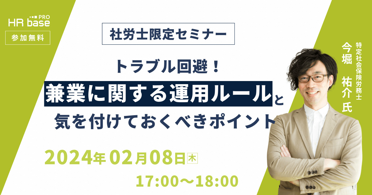 本セミナーでは、こうしたトラブルを防ぐために、法律事務所でパラリーガルとして数々の労使紛争案件に携わり特定社会保険労務士の今堀氏が「兼業を許可制にするための制度や運用方法」「そもそも兼業は禁止にできるのか」などを中心に解説します。兼業について、できるだけ企業側のデメリットを最小限に抑えるためのポイントについて解説します。ぜひご参加ください。