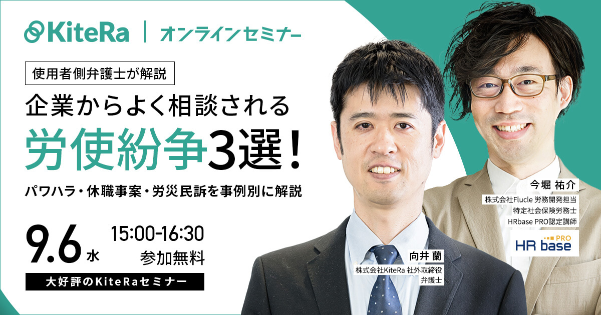 本セミナーでは、HRbase PRO労務開発担当 特定社会保険労務士の今堀祐介氏が、実際に顧問先から寄せられた質問をもとに事例を選出。「パワーハラスメント」「労災民訴」「休職事案」の3つの課題に対する対応策を具体例を用いて解説いたします。さらに、その内容について、法的な観点から杜若経営法律事務所の向井蘭弁護士が、弁護士とどう連携すべきか解説します。