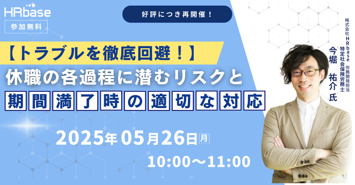 本セミナーでは、就業規則の休職事由の記載、試し勤務とリハビリ勤務、退職の合意など、休職の各過程に潜むリスクと適切な対応を具体的に解説します。講師は、法律事務所でパラリーガルとして数々の労使紛争案件に携わり、トラブル対応をテーマにした多くのセミナーに登壇実績のある、特定社会保険労務士の今堀が務めます。