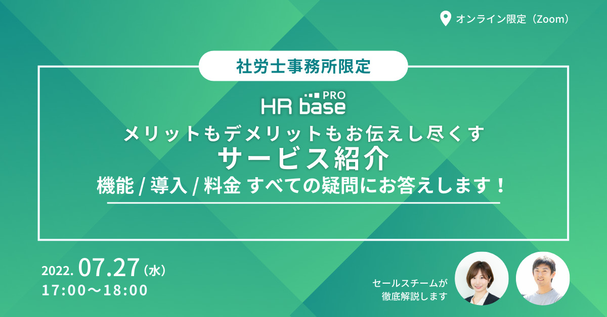 HRbase PROはどんどん進化しています。それはすべて、社労士先生の使いやすさのため。とはいえ、導入の検討にはさまざまな事前情報が必要かと思います。そこで、社労士先生の疑問にまるっとお答えするサービス紹介を開催いたします。