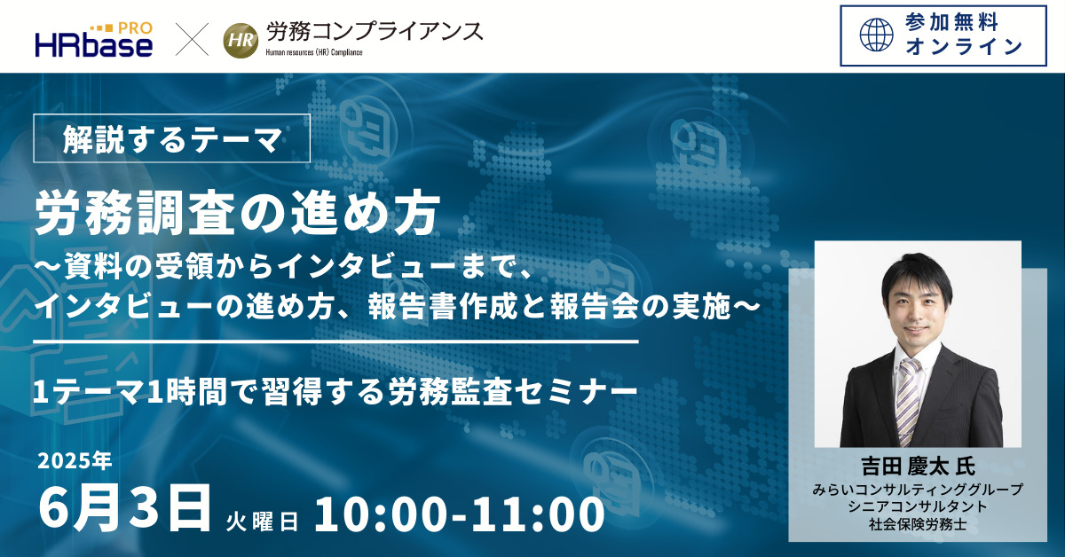 本セミナーでは、金融機関向けの勉強会・セミナー登壇で受けた質問や相談への回答を参考に、実務に役立つ労務コンプライアンス調査の対応方法について、みらいコンサルティンググループ吉田氏よりお話していただきます。