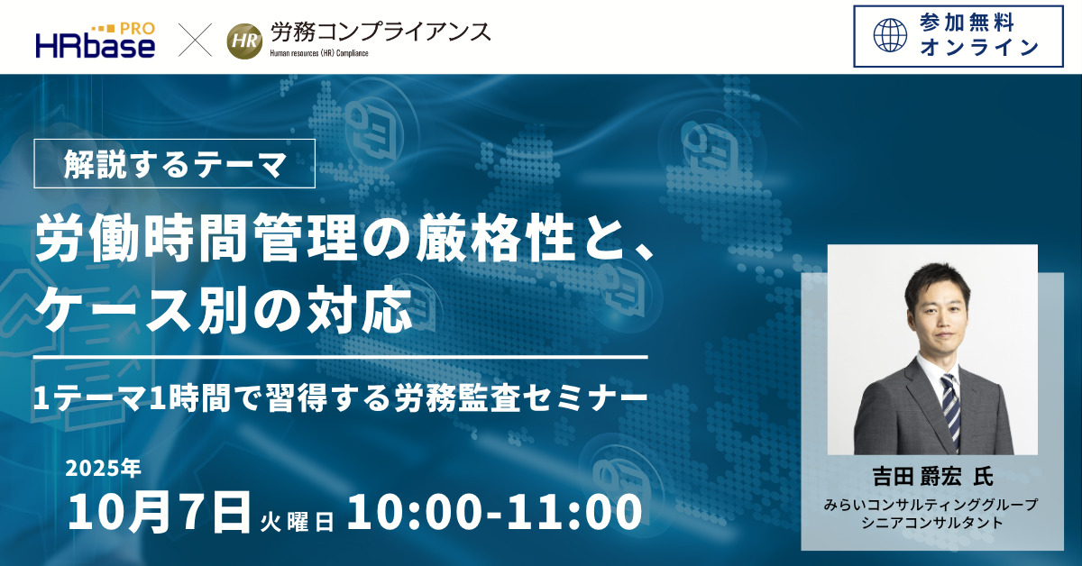 本セミナーでは、金融機関向けの勉強会・セミナー登壇で受けた質問や相談への回答を参考に、実務に役立つ労務コンプライアンス調査の対応方法について、みらいコンサルティンググループ吉田氏よりお話していただきます。