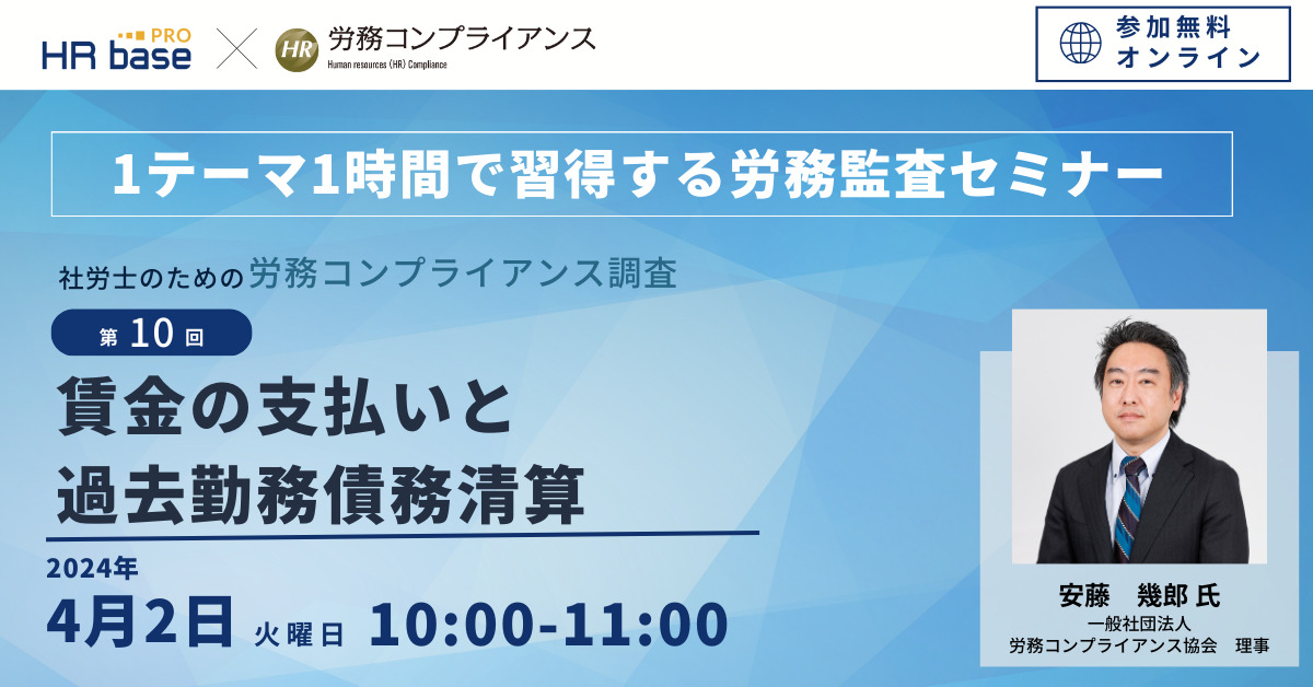 | セミナー名 | 【第10回】1テーマ1時間で習得する労務監査セミナー 社労士のための労務コンプライアンス調査【定期開催】 |