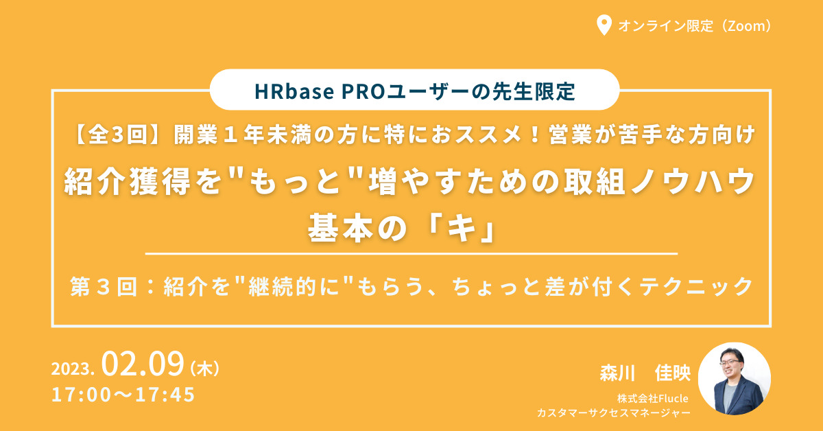 HRbasePROをご利用いただいている先生方限定でのセミナーを開催!今回は「紹介獲得について」をテーマに、全3回でセミナーを実施させていただきます。
