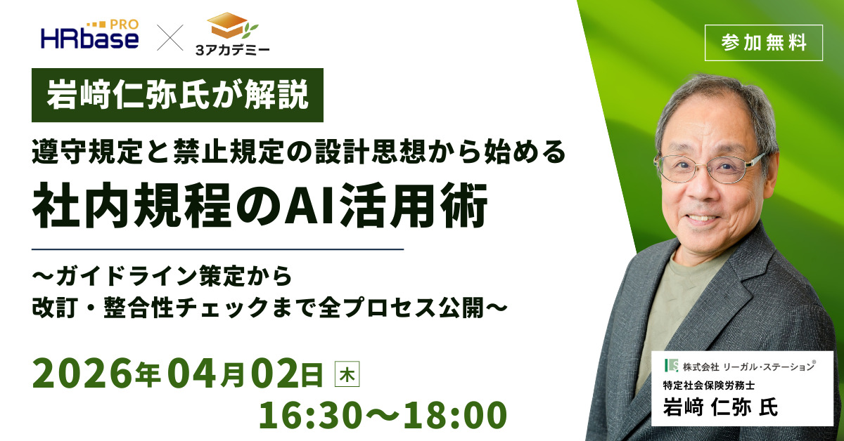 本セミナーでは、『リスク回避型就業規則・諸規程作成マニュアル』著者として知られる株式会社リーガル・ステーション代表・岩﨑仁弥氏が、この設計思想を軸に「生成AIの遵守規定・禁止規定をどう描くか」から始めて、社内ガイドライン策定、そして就業規則・社内諸規程全般のAI活用実演デモまでを一気通貫でご覧いただきます。