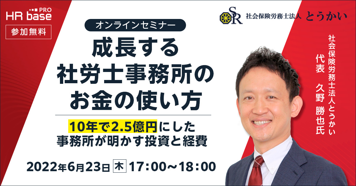 取引先や従業員が増えていく中で、事務所の経営に関する問題が発生していきます。事務所の運営課題の解決には、どれだけ「経費」を削減できるかではなく、適切なリソース配分ができているかどうかが大切です。業務効率化や教育のためにも、経費をIT・教育ツールにどれだけ使うか計画することが重要ではないでしょうか。今回のセミナーでは、事務所の売り上げを10年で2.5億円にした社会保険労務士法人とうかいの久野先生に、とうかいで実施する教育方法や活用しているITツールご紹介、事務所経費の配分についての事例をお話いただきます。
